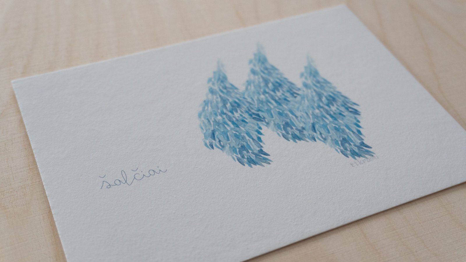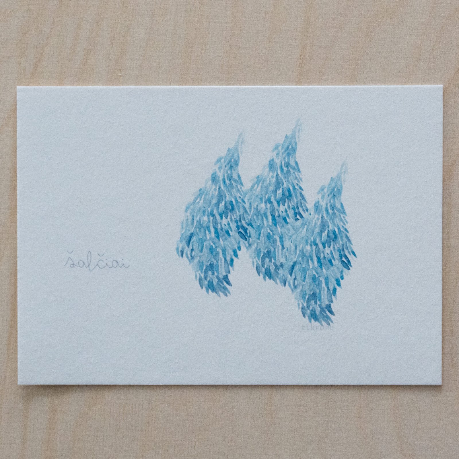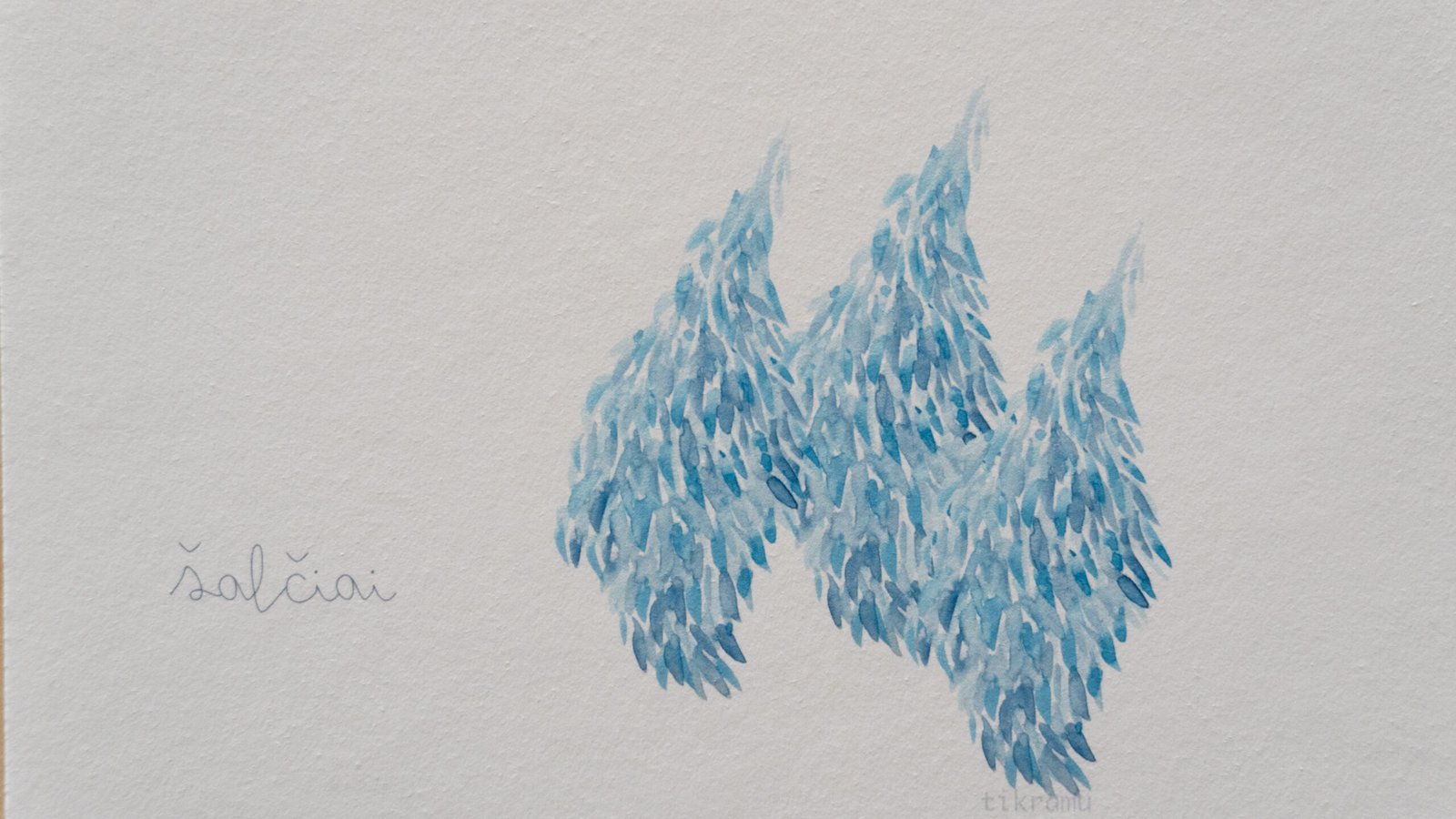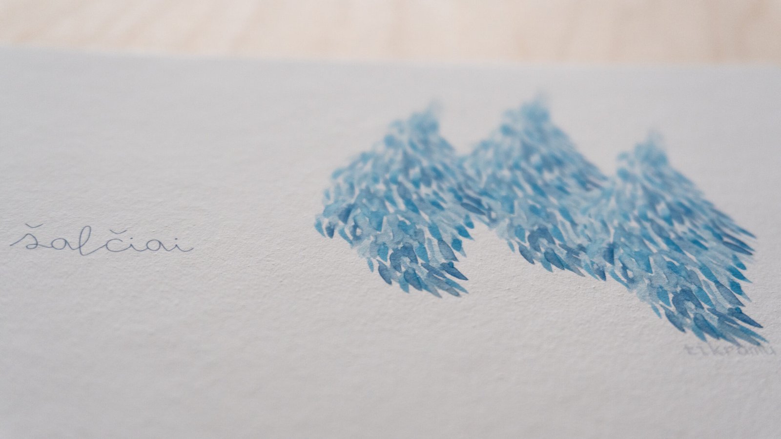 Akvarele pieštas piešinys, kuris vėliau pritaikytas spausdinimui. Galima matyti, kaip susilieja, žaidžia tikros spalvos. Liedžia pažadinti vaizduotę ir šiame abstrakčiame piešinyje rasti įvairias formas, pasislėpusius gyvūnus, o gal tiesiog pasimėgauti ramumu besislepiančiu netobuluose potėpiuose.
