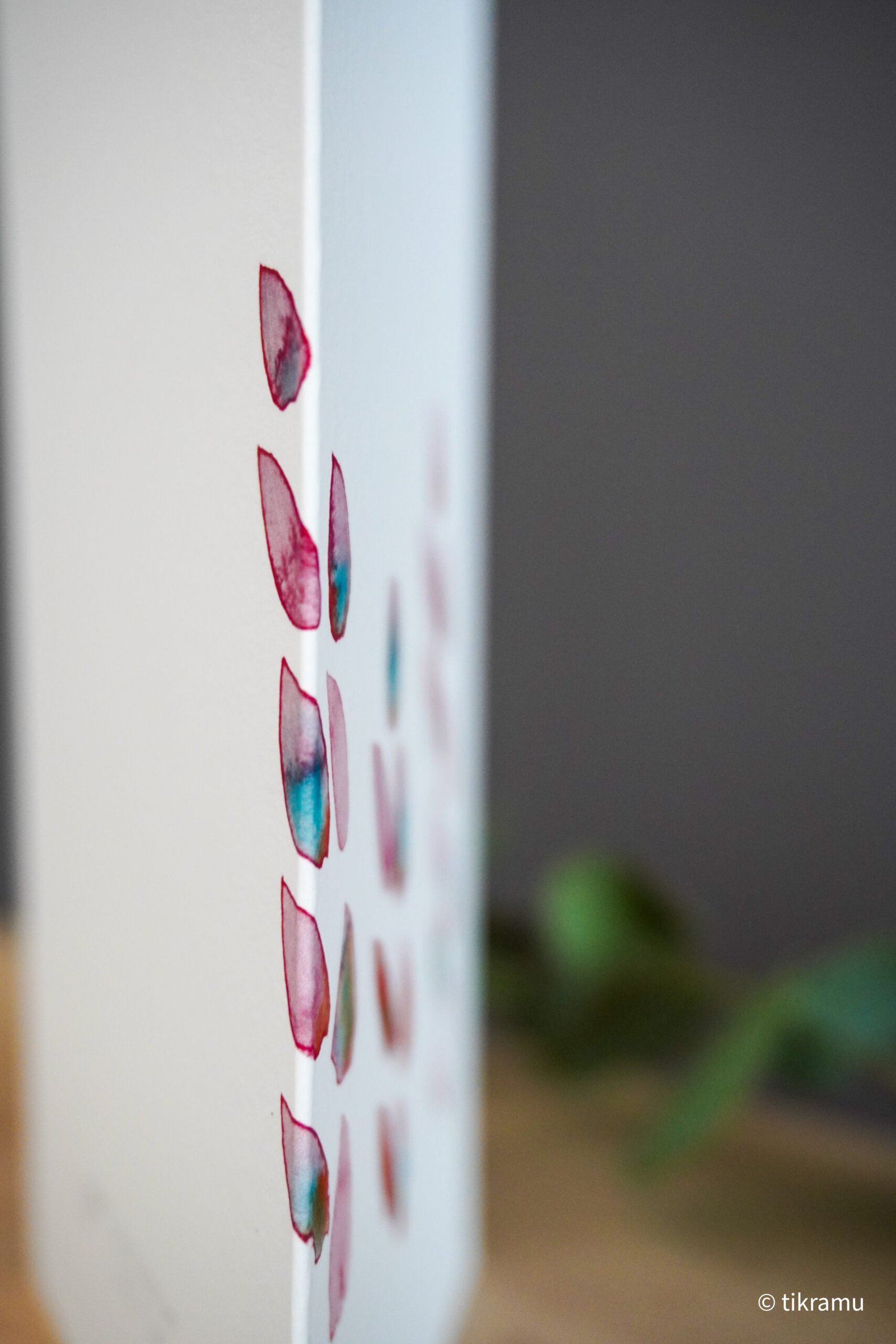Akvarele pieštas piešinys, kuris vėliau pritaikytas spausdinimui. Galima matyti, kaip susilieja, žaidžia tikros spalvos. Liedžia pažadinti vaizduotę ir šiame abstrakčiame piešinyje rasti įvairias formas, pasislėpusius gyvūnus, o gal tiesiog pasimėgauti ramumu besislepiančiu netobuluose potėpiuose.